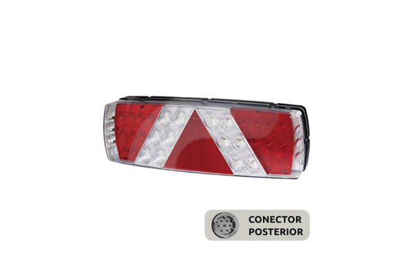 Piloto trasero con triángulo LED 24 V Universal Derecho. Antiniebla, marcha atrás, posición, freno e intermitente, con catadióptrico y baliza lateral, conexión eléctrica mediante conector posterior AMP 7 pines. Medidas 445 x 139 x 30 mm.