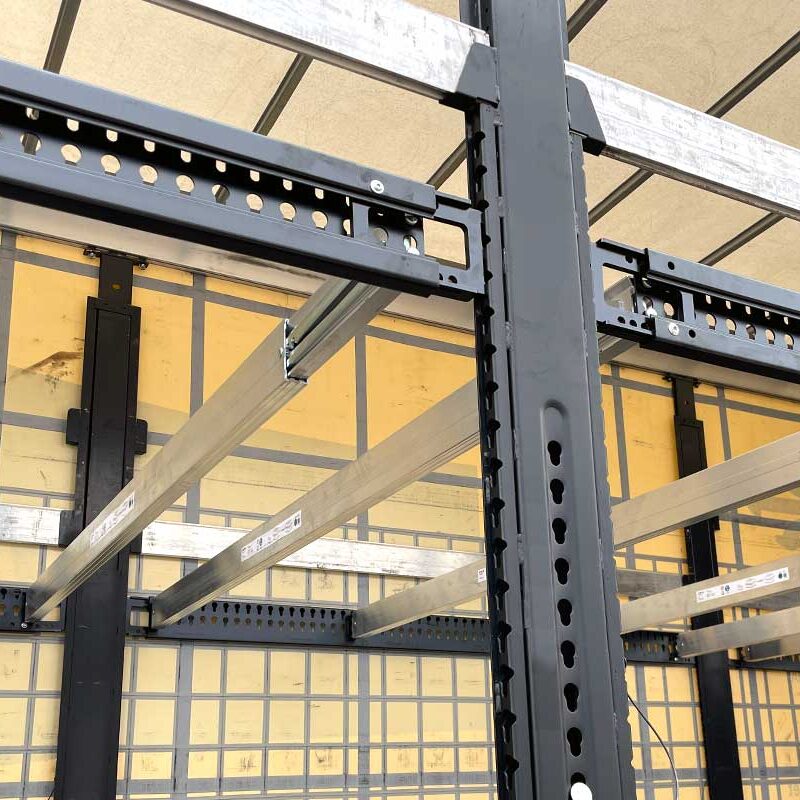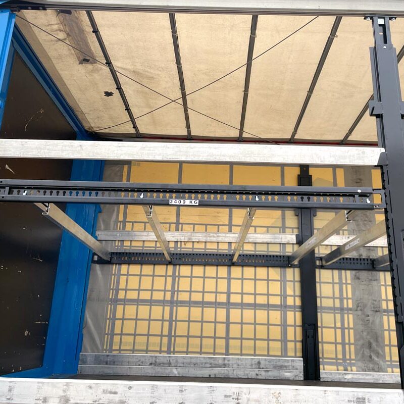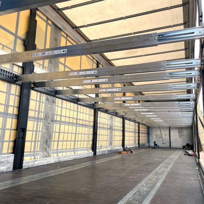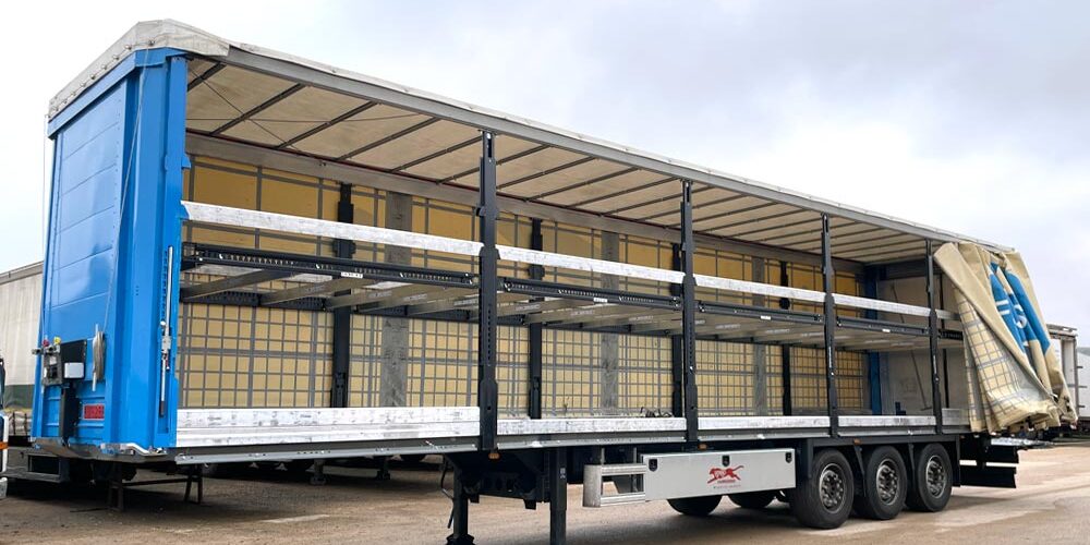Este sistema permite cargar a dos niveles de altura regulable. El espacio útil se duplica y la capacidad de carga pasa de 33 palets europeos hasta 1.50 metros de altura, a 66 palets en un solo camión.